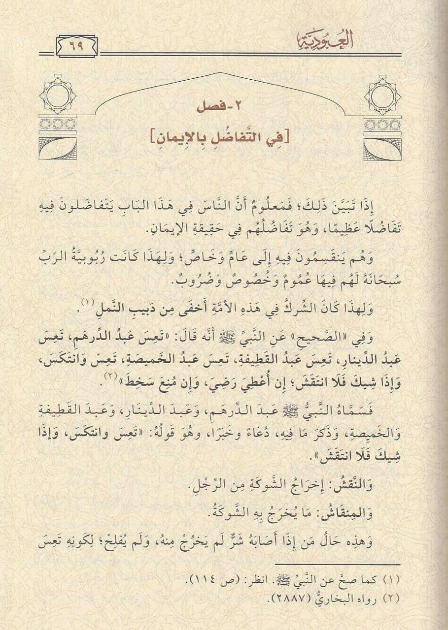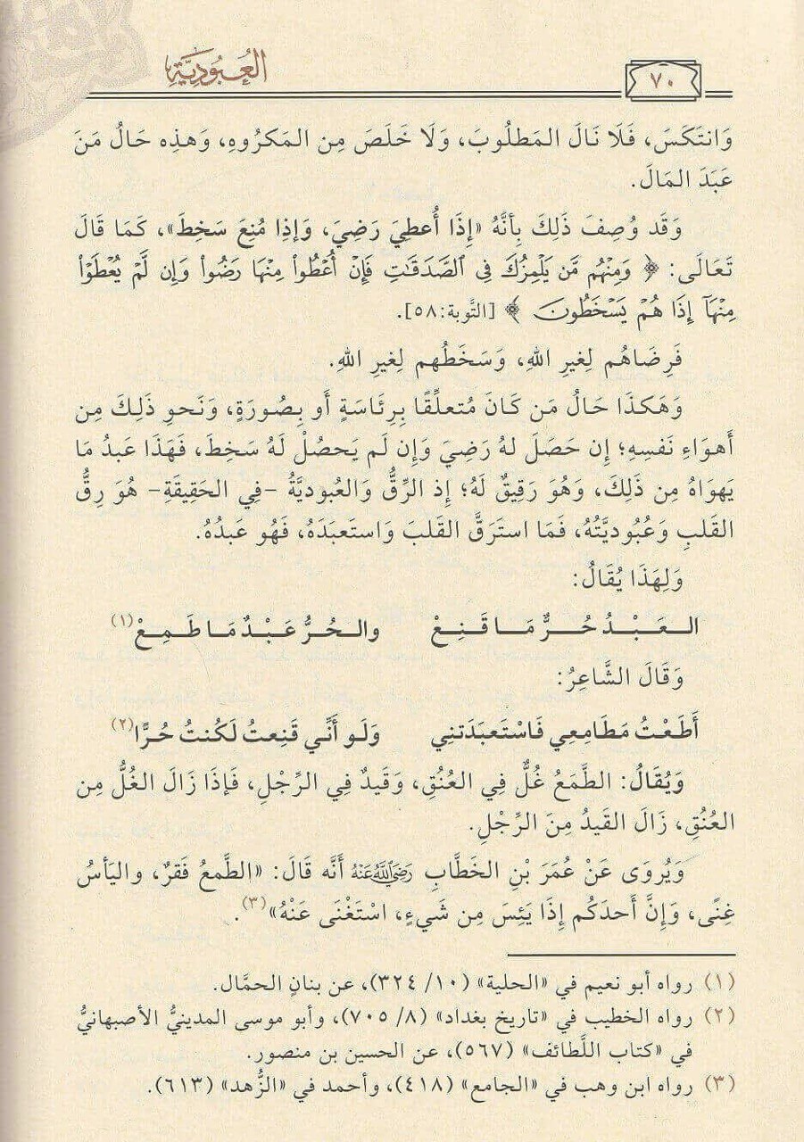 رسالة العبودية: هذه الرسالة صغيرة في مبناها، كبيرة في معناها، والتي كانت من شيخ الإسلام ابن تيمية جوابًا على سؤال وُجِّه إليه، عن معنى الآية الكريمة: {يا أيها الناس اعبدوا ربكم الذي خلقكم والذين من قبلكم لعلكم تتقون . فما العبادة؟ وما فروعها؟ وهل مجموع الدين داخل فيها؟ أم لا؟ وما حقيقة العبودية؟ وهل هي أعلى المقامات في الدنيا والآخرة؟ أم فوقها شيء من المقامات؟ فكان جوابه – رحمه الله – ما سيأتي في هذه الرسالة القيَّمة. وقد نفى شيخ الإسلام ابن تيمية عن هذه (العبودية) ما علق بها من الضلال، والخرافة، وما شاع في المعتقد من الجهل عند الكثيرين من المساكين، الذين تورَّطوا – وأكثرهم – بحسن نية، باتباع بعض المشايخ الجهَّال، أو المدلسين الضالين، الذين اندسُّوا في الأوساط الإسلامية خلال عقود كثيرة .