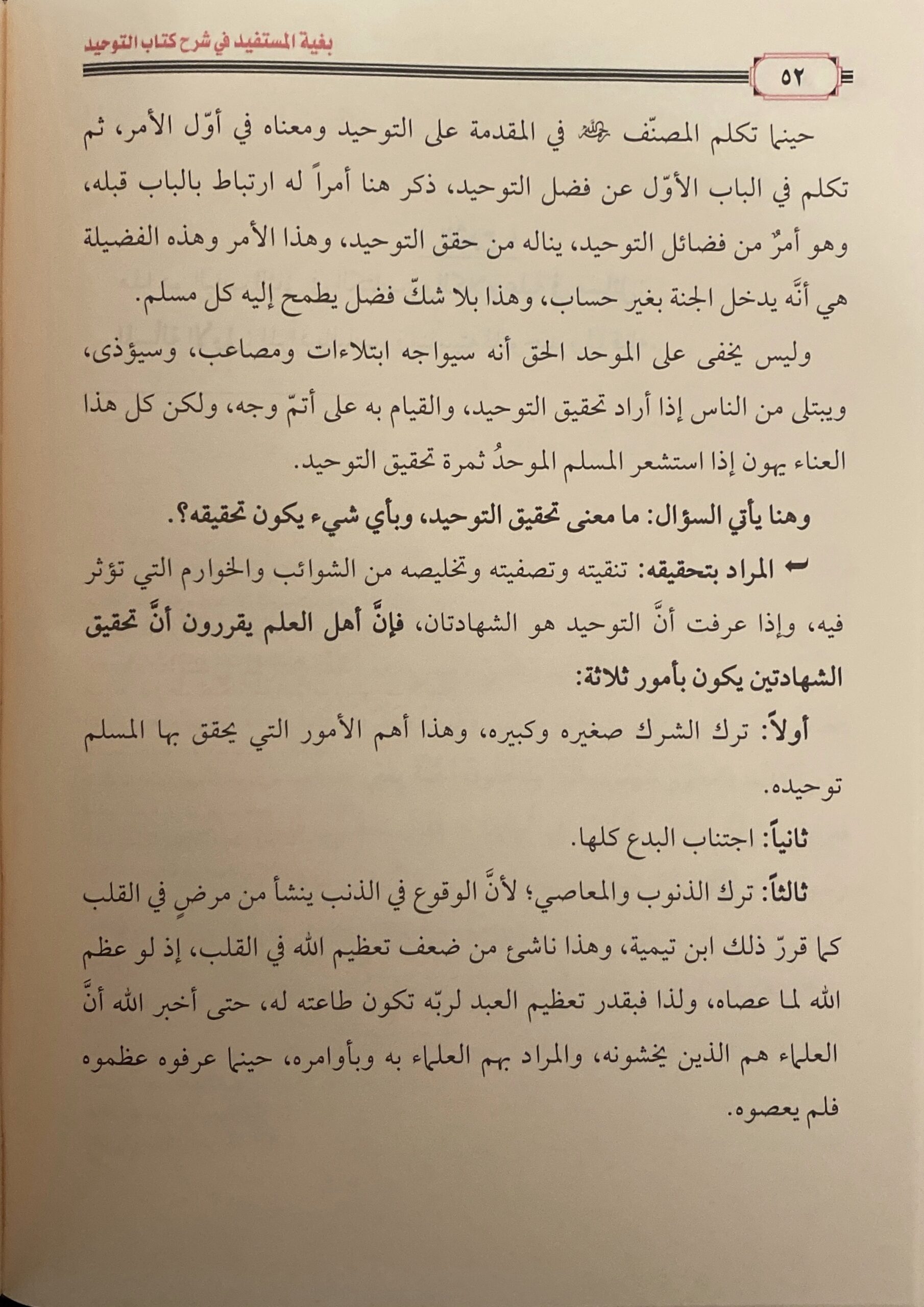 …وممن وفقه الله لكشف كثير من غشاوة الشرك، وتصحيح مسار التوحيد، ونبذ معالم الباطل الحسية والمعنوية الإمام المجدد محمد بن عبد الوهاب التميمي – رحمه الله تعالى. ومن جهود الشيخ في قلمه، هذا الكتاب الذي سطره للناس، وكانوا وما زالوا ينتفعون به كتاب التوحيد الذي هو حق الله على العبيد وسيأتي الكلام على الشيخ وكتابه في المقدمات بحول الله. وقد يسر الله لي كتابة شرح موجز على هذا الكتاب المبارك، فأشار على بعض الأحبة بإخراجه لعل الله أن ينفع به.