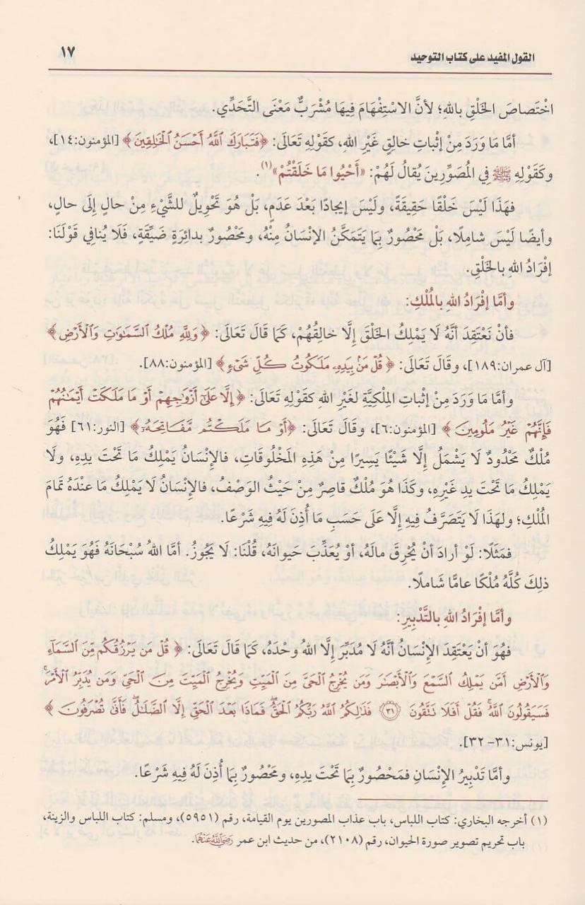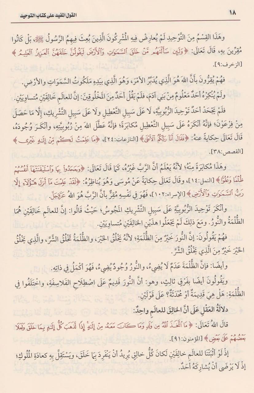كتاب مهم جداً لكل قارئ تناول فيه مؤلفه موضوع التوحيد حيث بيّن معناه وأقسامه وكلّ ما يتعلق به، والكتاب مقسّم في أبواب مثل: باب من الشّرك إرادة الإنسان بعمله الدنيا، وباب من جحد شيئاً من الأسماء والصفات.وباب وصف الله الحاكمين بغير ما انزل الله وباب ما جاء في الرياء وباب التسمي بقاضي القضاة باب احترام أسماء الله وتغيير الاسم لأجل ذلك باب قول اللهم اغفر لي إن شئت… وغير ذلك من الأبواب الهامّة.