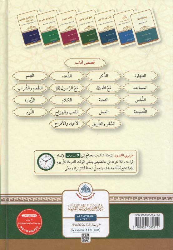 قصص في الآداب هو سلسلة تربوية إسلامية تهدف إلى تعزيز القيم والأخلاق الإسلامية. تتضمن هذه السلسلة مجموعة متنوعة من القصص والحكايات التي تمتاز بالأسلوب السهل والمشوق والمهذب. تمت كتابتها بواسطة خبراء في الأدب والفكر من أهل العلم والإيمان، وتجمع بين القصص القرآنية والحديث الشريف وروائع التراث الإسلامي. تحمل هذه القصص العبر والفوائد، وتوضح السبل النافعة لتحقيق الفضائل والتقوى والابتعاد عن الرذائل. إنها مجموعة متنوعة من القصص التي تسعى إلى رفع مستوى الروحانية والكمال في الفرد.